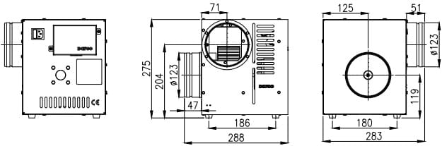 Posiada odizolowany termicznie i akustycznie wentylator nadmuchujący powietrze.
