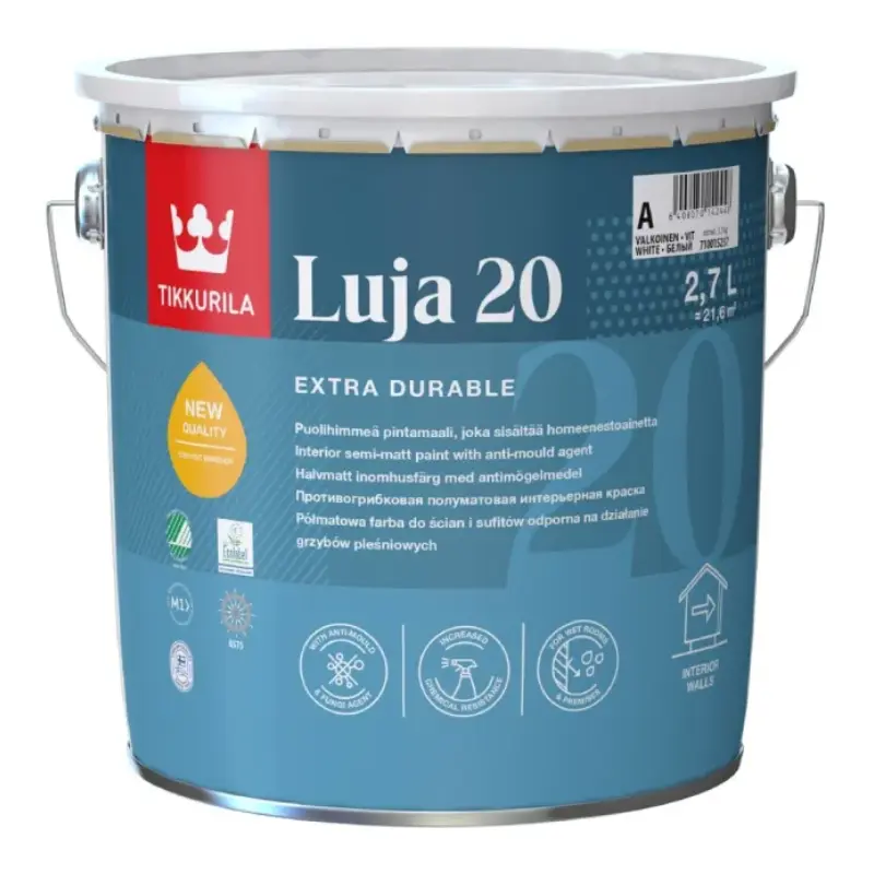Luja 20 Semi Matt to specjalistyczna farba akrylowa przeznaczona do wnętrz, w tym do łazienek i pomieszczeń wilgotnych. Produkt zawiera składniki biobójcze chroniące powłokę farby, cechuje się wysoką odpornością na zmywanie i zużycie oraz posiada niski poziom emisji LZO. Certyfikaty Nordic Swan Ecolabel, EU Ecolabel oraz znak M1 potwierdzają jej przyjazność dla środowiska i niską emisję substancji lotnych. Farba spełnia również wymagania MED (Marine Equipment Directive), co umożliwia jej stosowanie na powierzchniach wewnętrznych statków.
