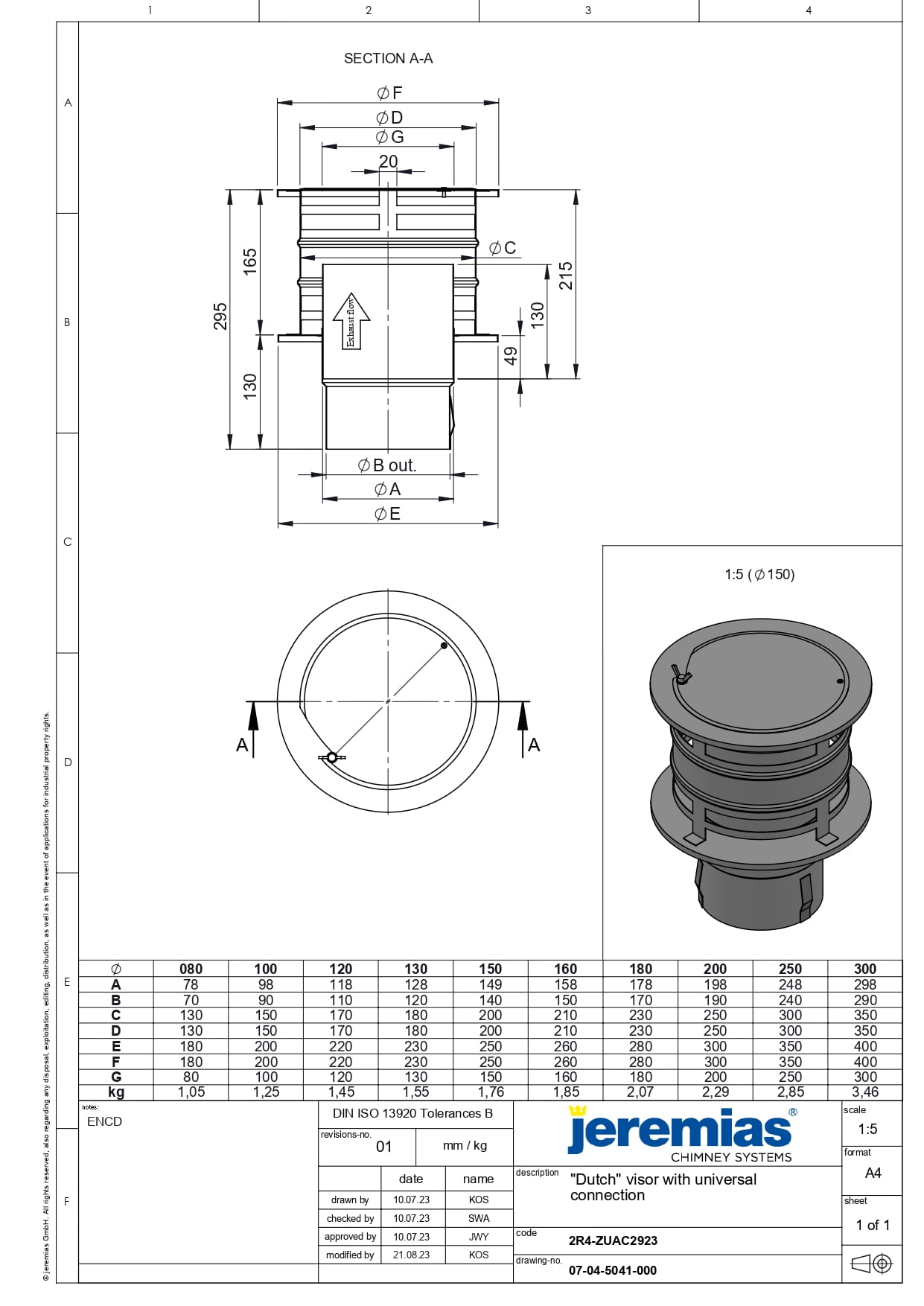 Daszek kominowy holenderski z rewizją - przyłącze uniwersalne rdzeń fi160 Jeremias