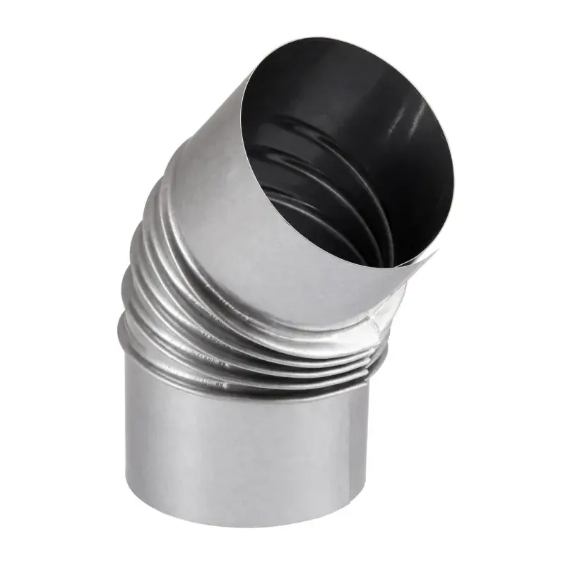 Kolano wykonane jest z czarnej blachy stalowej aluminizowanej i łączone metodą zawijania na zakładkę, co zapewnia odpowiednią szczelność oraz trwałość w trakcie użytkowania. Produkt charakteryzuje się odpornością na temperaturę oraz jest dostosowany do pracy w instalacjach gazowych i olejowych.