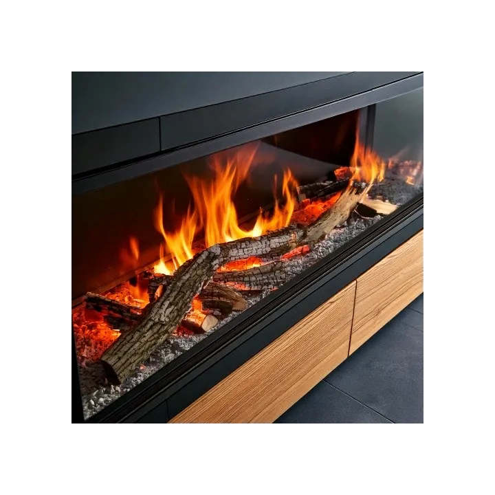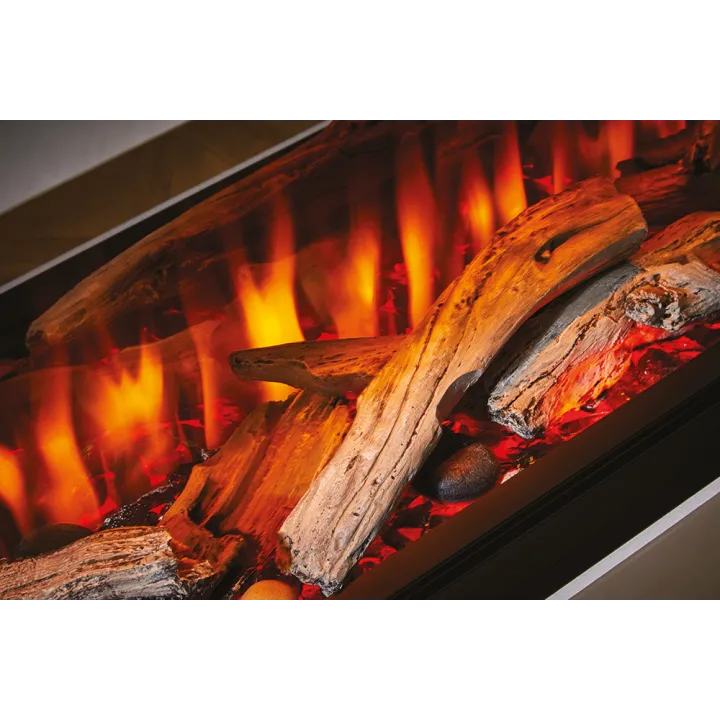 - Personalizacja wyglądu paleniska: W standardzie kominek wyposażony jest w zestaw polan leśnych. Opcjonalnie dostępne są zestawy drewna dryfującego lub polan ciętych na ćwiartki, pozwalające zmienić charakter i styl paleniska.
