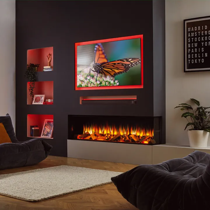 - Opcjonalne oświetlenie LED: Taśmy LED dostępne w różnych długościach można podłączyć do kominka lub zabudować w ścianie. Światło sterowane jest pilotem i może być ustawione niezależnie od efektów płomieni i łoża paliwowego.