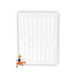 Dwuczęściowa kratka wentylacyjna z tworzywa. Posiada ramkę oraz płaski szyld z zamykaną przesuwną żaluzją.