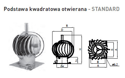 OBROTOWA NASADA KOMINOWA TURBOWENT Z ZEWNĘTRZNYM ŁOŻYSKOWANIEM PODSTAWA KWADRATOWA STANDARD (OTWIERANA) 250X250MM - TURBINA CHROMONIKLOWA, PODSTAWA BL. CHROMONIKLOWA FI150 FIRMY DARCO.