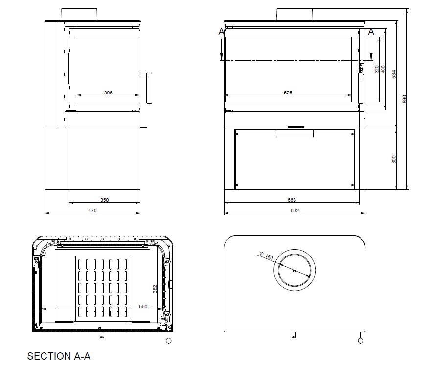 - Wewnętrzna/zewnętrzna średnica króćca wylotu dymu: 160 / 180 mm