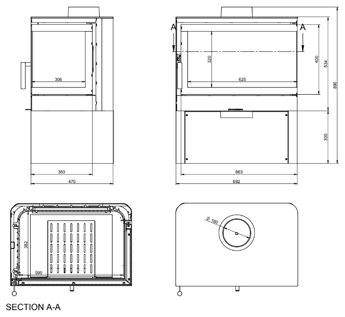 - Wewnętrzna/zewnętrzna średnica króćca wylotu dymu: 160 / 180 mm