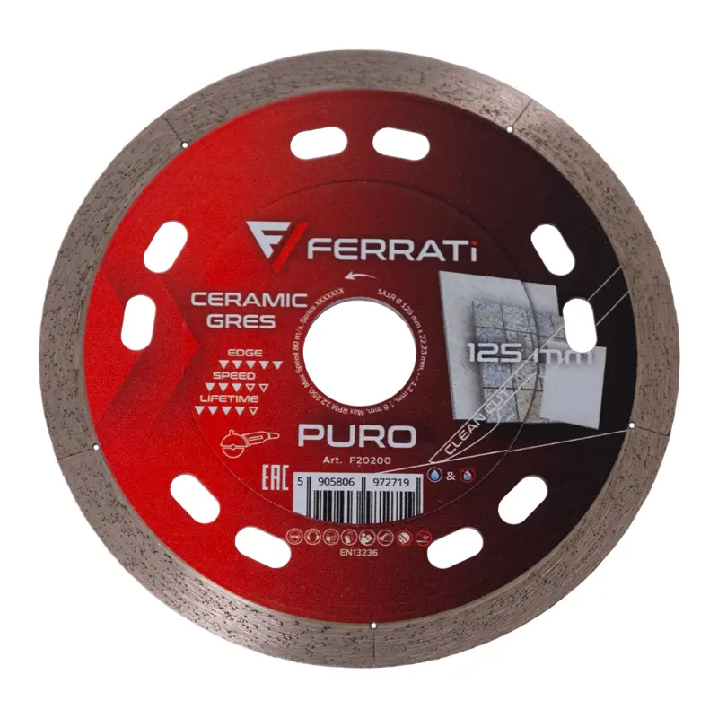 Tarcza diamentowa Puro została stworzona z myślą o profesjonalistach wymagających precyzyjnego i niezawodnego cięcia. Idealnie sprawdza się przy obróbce ceramiki, gresu, spieków kwarcowych oraz kamienia naturalnego, zapewniając czyste cięcie przy średnio-długich i długich odcinkach (120–200 cm). Dzięki ciągłemu segmentowi dzielonemu na pięć części i wzmacnianemu korpusowi tarcza jest odporna i efektywna w trudnych warunkach pracy.