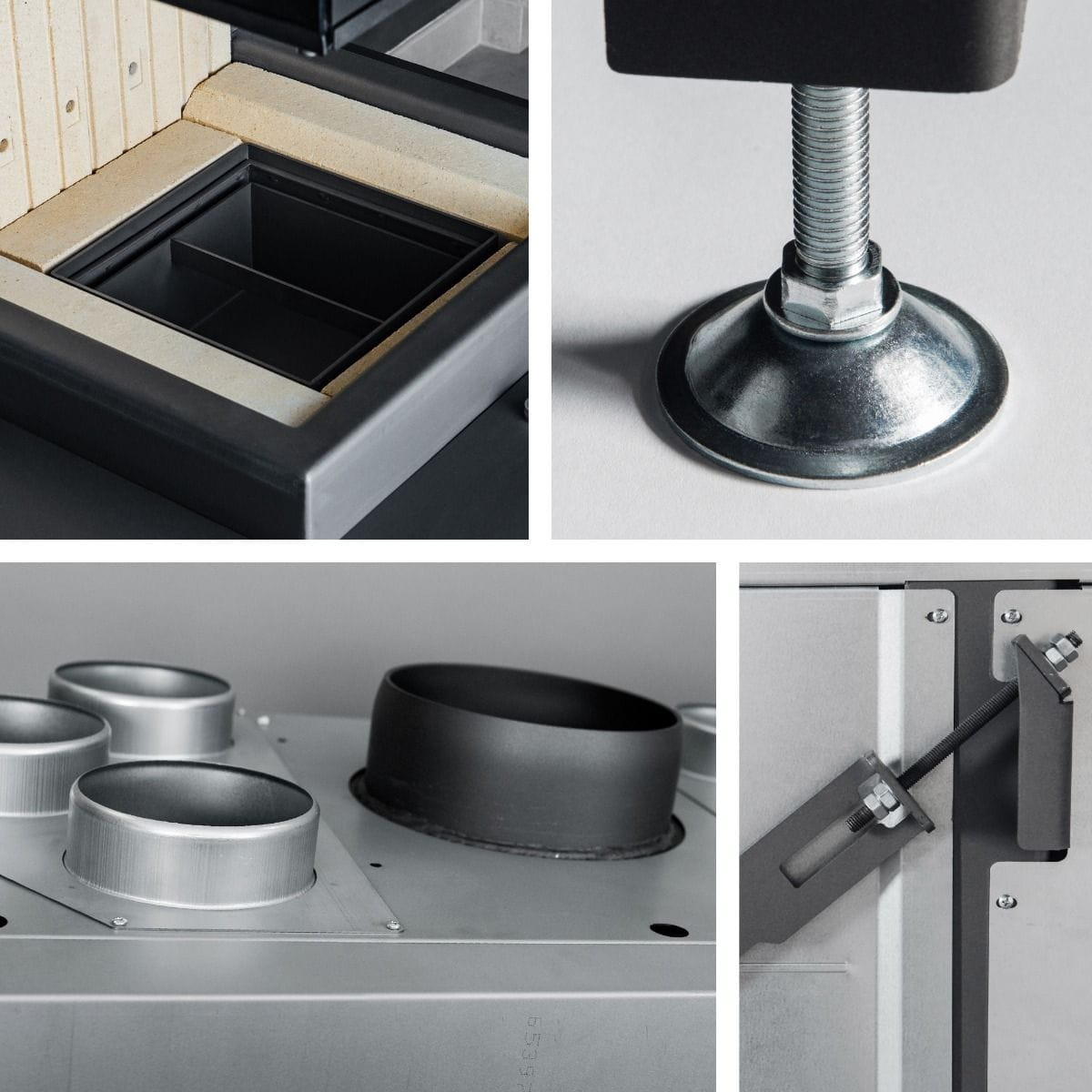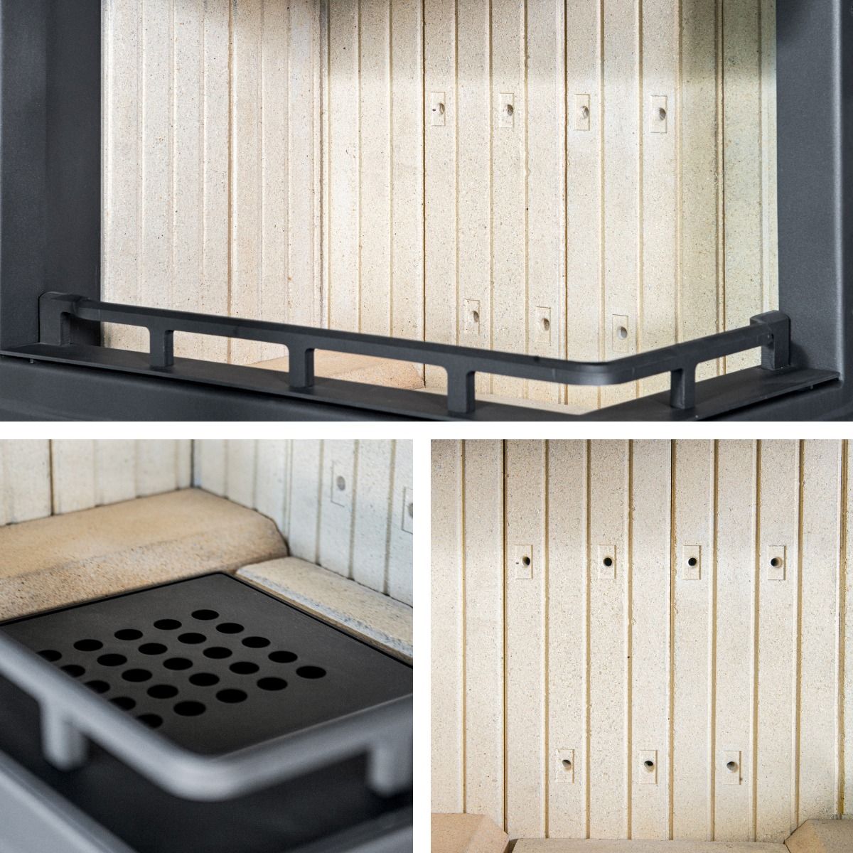 - Wyłożenie paleniska kształtkami szamotowymi podwyższa temperaturę spalania oraz kumuluje ciepło, aby oddawać je po wygaszeniu ognia.