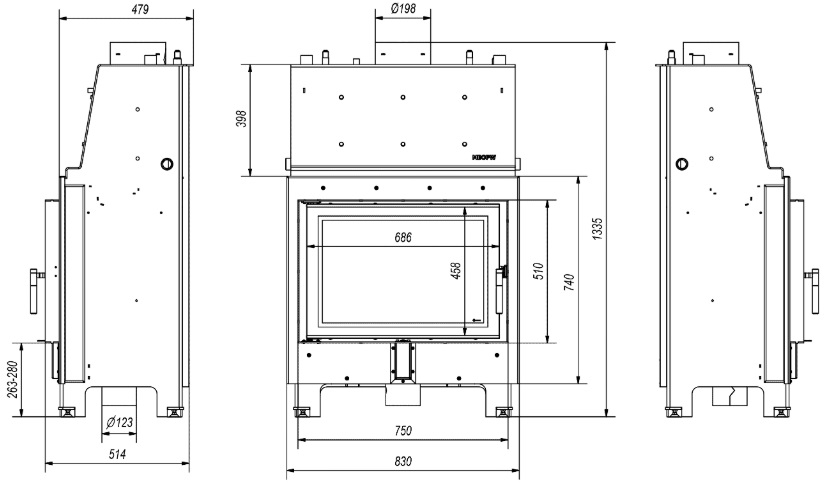 Wkład bezrusztowy - dopalanie na popiele, co oznacza, że opał wypala się na drobny popiół, którego pozostaje minimalna ilość. Uzyskana w ten sposób energia cieplna z drewna zostaje maksymalnie wykorzystana. Płyta dolna wkładu znacznie obniżona w stosunku do drzwi.